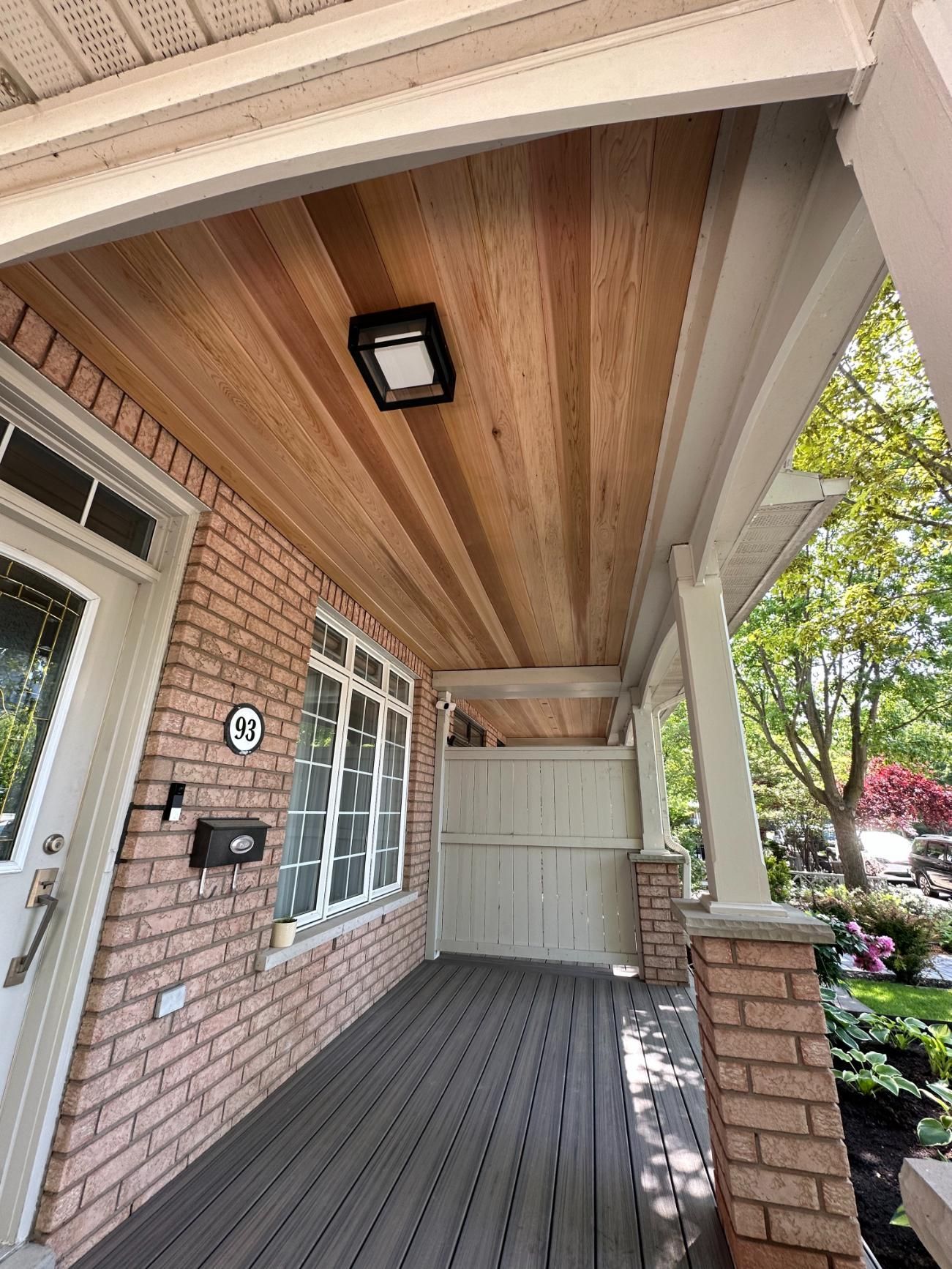 - A clear cedar tongue & groove soffit that beautifully complements the new porch.