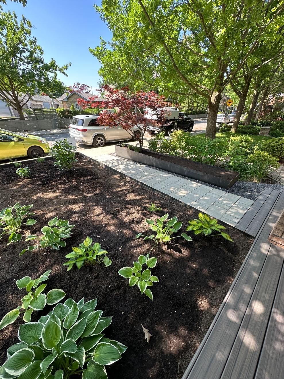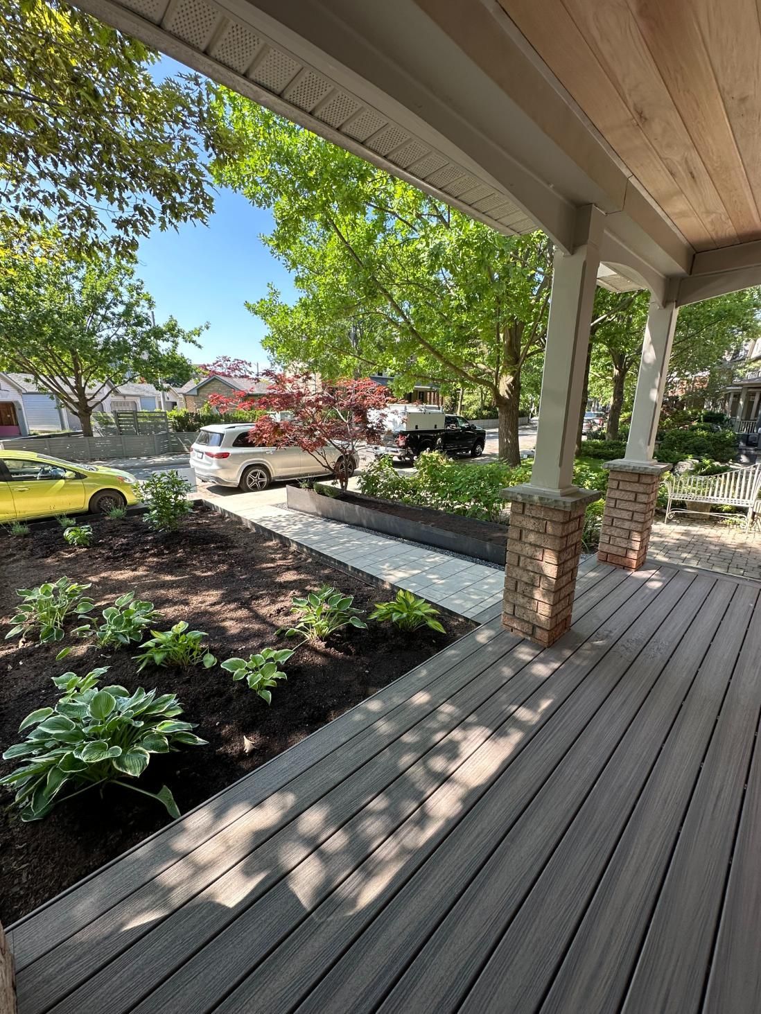 Revitalize the front yard with a striking, low-maintenance design that enhances curb appeal and durability. The project will replace the old flagstone with modern, complementary materials, including Corten steel planters for a bold statement. The existing porch will be overlaid with Trex composite decking, ensuring longevity and effortless upkeep while creating a cohesive, standout aesthetic.