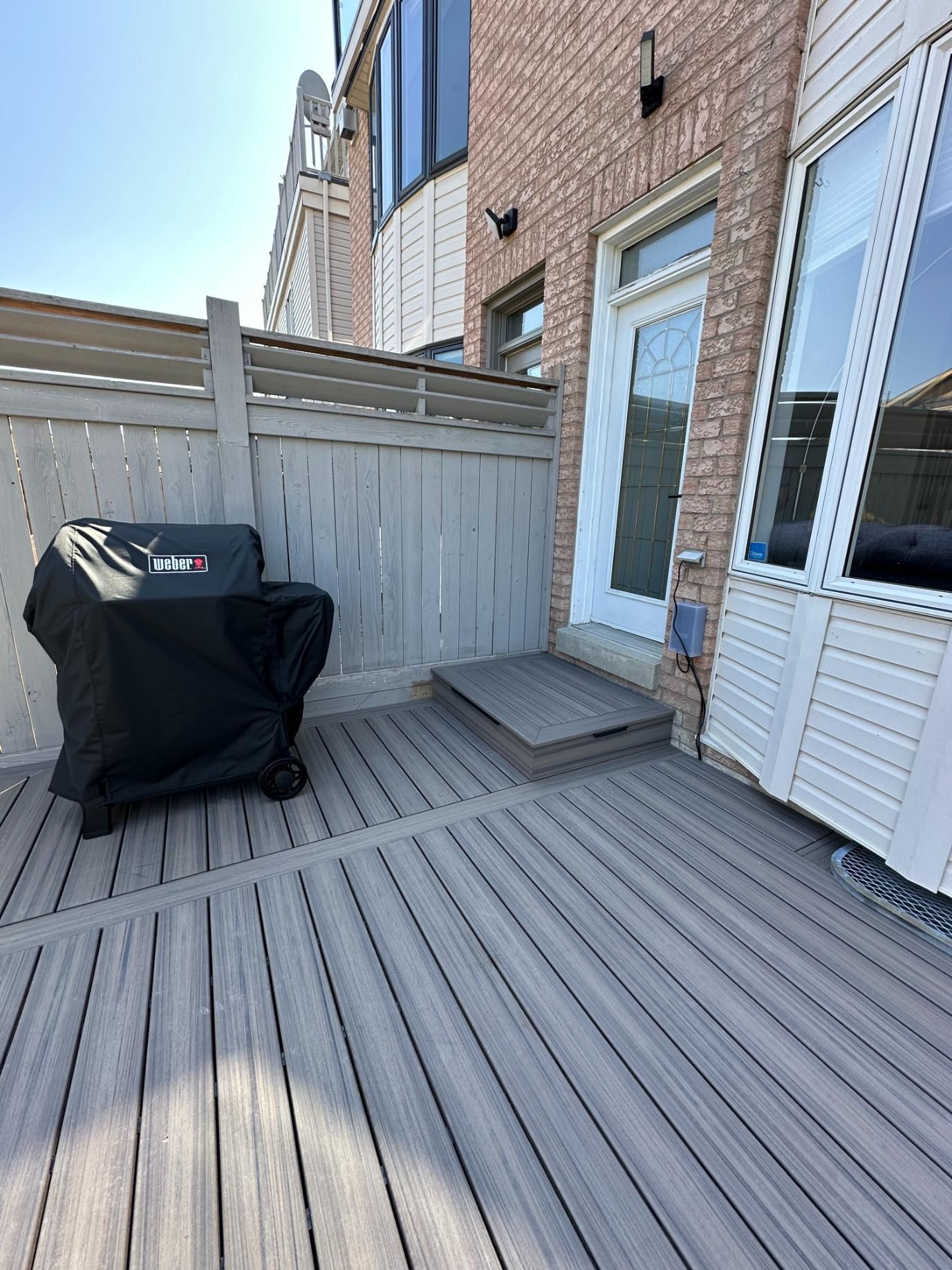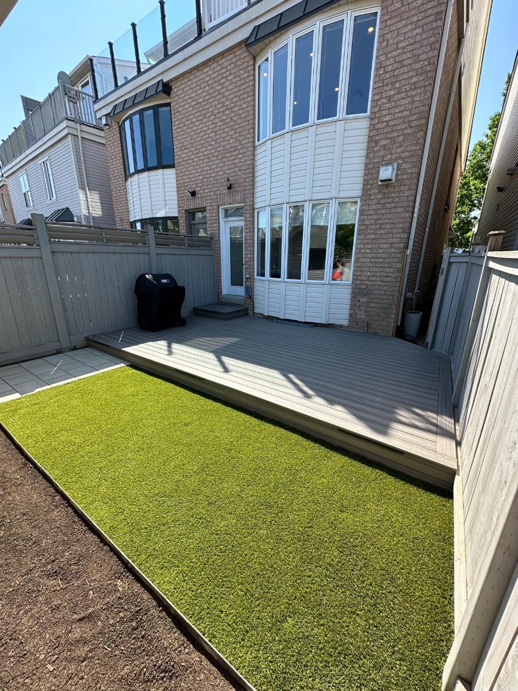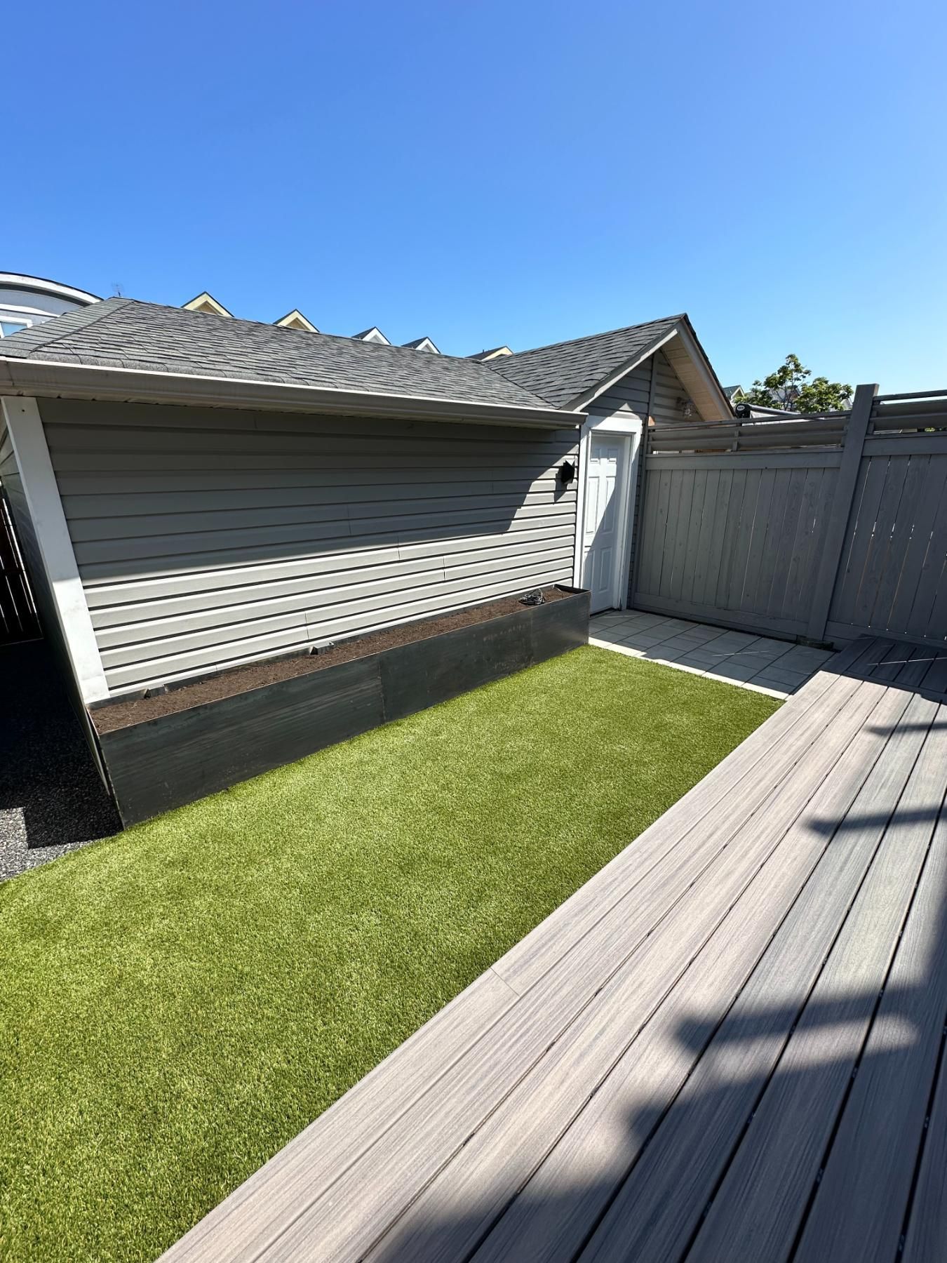 Transform the backyard into a functional and cohesive extension of the front yard, replacing the deteriorating flagstone with a durable composite deck, a sleek walkway, and a low-maintenance artificial turf play area for the kids. The design will seamlessly integrate materials used in the front yard to create a unified aesthetic, enhanced by strategically placed outdoor lighting for both ambiance and safety.